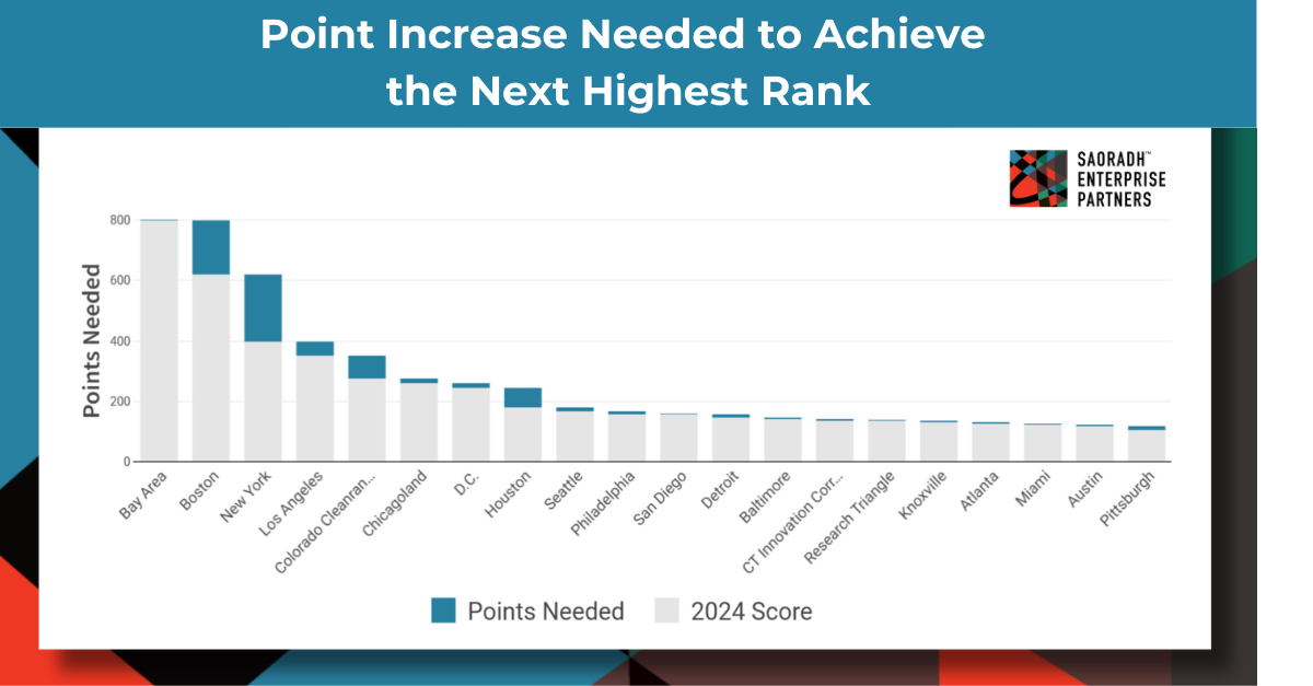 Cleantech’s leaderboard is shifting. The Bay Area continues to hold the crown as the top U.S. cleantech hub—but its grip is loosening. Between 2021 and 2024, it lost 9% of its relative strength, dropping 86 points (out of 1,000)—the only top-20 hub to see a decline.