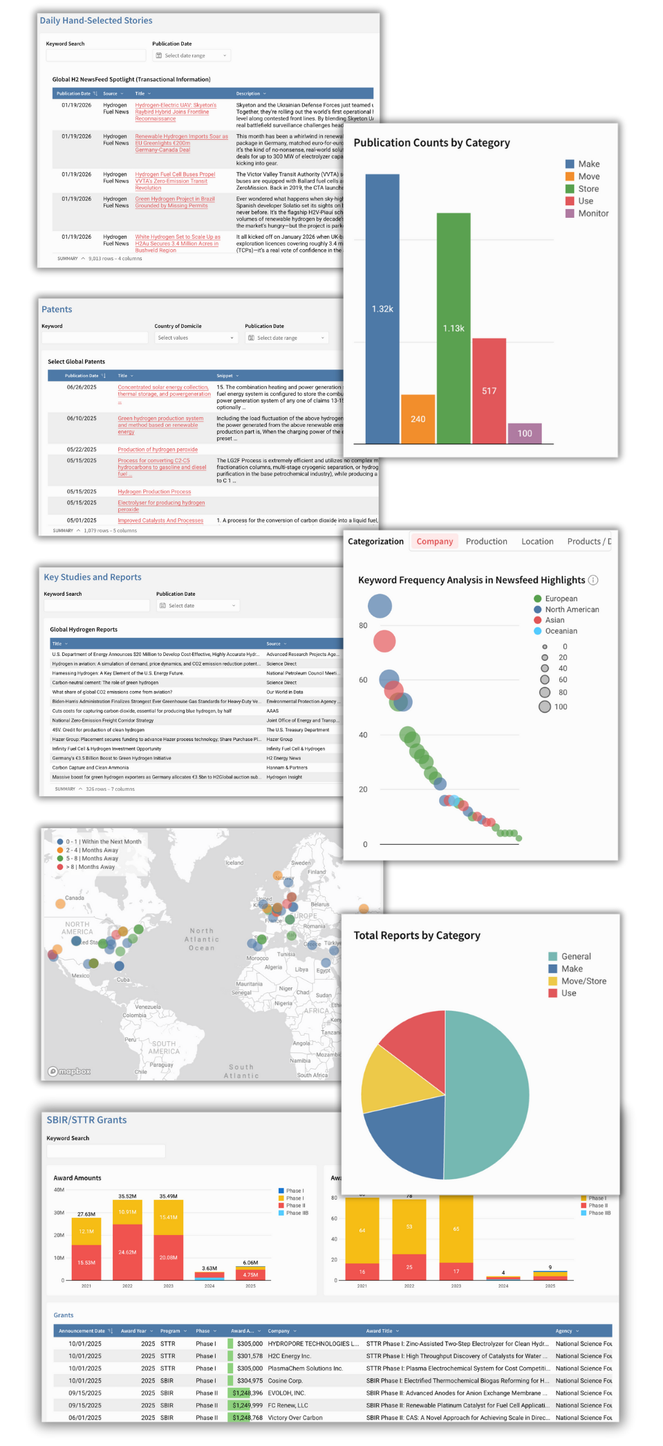 Each business day, our proprietary system scans articles from over 100 global sources — tracking M&A, project technology developments, capital flows, policy signals, pricing and supply-demand dynamics in the hydrogen, carbon, and derivatives ecosystem.